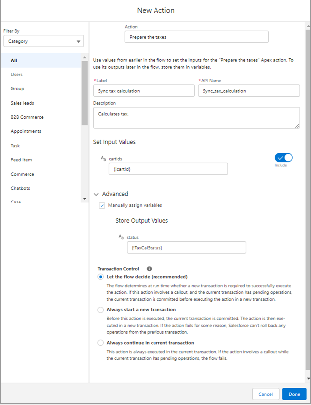 Add the Sync tax calculation (Apex Action) node