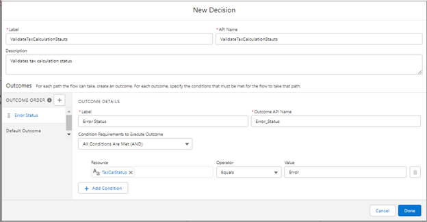 Create a new Decision node to validate if the tax calculation status is Error
