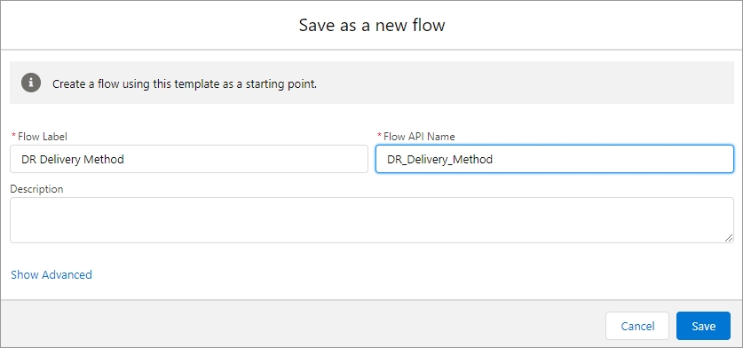 Enter the name of the delivery method subflow in the Flow Label field (for example,