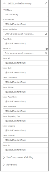 {!$GlobalConstant.False}or{!$GlobalConstant.True}Use this to control the executing order placement logic of mutiple components.If there is more than one drb2b_orderSummary component on the page, set the Place Order attribute to True for one component and set the rest of the order summary components to False. If there is only one drb2b_orderSummary component on the page, make sure to keep the Place Order attribute set to True (the default value).