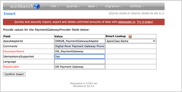 // WebStore query values String webstoreName = 'DR Sync Store'; // Enter your webstore name // ApexClass query values String apexClassname = 'DRB2B_CartTaxCalculations'; String status = 'Active'; // RegisteredExternalService insert values String registeredProviderType = 'Tax'; String registeredDevName = 'DR_COMPUTE_TAXES'; String registeredLabel = registeredDevName; // StoreIntegratedService insert values String devname = registeredDevName; String prefix = registeredProviderType; String prefixedName = prefix + '__' + devname; // locate webstore WebStore webStore = Database.query('SELECT Id FROM WebStore WHERE Name = :webstoreName LIMIT 1'); String webStoreId = webStore.Id; System.debug('webStoreId:' + webStoreId); // locate apex class Id ApexClass apexClass = Database.query('SELECT Id FROM ApexClass WHERE Status=:status AND Name=:apexClassname LIMIT 1'); String apexClassId = apexClass.Id; System.debug('apexClassId:' + apexClassId); // locate apex in RegisteredExternalService String registeredIntegrationId = null; try { RegisteredExternalService registeredExternalService = Database.query('SELECT Id FROM RegisteredExternalService WHERE ExternalServiceProviderId=:apexClassId AND DeveloperName=:registeredDevName AND ExternalServiceProviderType=:registeredProviderType LIMIT 1'); registeredIntegrationId = registeredExternalService.Id; System.debug('apex class registration: FOUND ' + registeredIntegrationId); //delete registeredExternalService; // optionally remove if needed } catch (QueryException q) { System.debug('apex class registration: MISSING ' + apexClassId); insert new RegisteredExternalService(DeveloperName = registeredDevName, MasterLabel = registeredLabel, ExternalServiceProviderId = apexClassId, ExternalServiceProviderType = registeredProviderType); RegisteredExternalService registeredExternalService = Database.query('SELECT Id FROM RegisteredExternalService WHERE ExternalServiceProviderId = :apexClassId LIMIT 1'); registeredIntegrationId = registeredExternalService.Id; System.debug('apex class registration: INSERTED ' + registeredIntegrationId); }Select Id, ExternalServiceProviderId, ExternalServiceProviderType, DeveloperName From RegisteredExternalService Where ExternalServiceProviderType = 'Tax'