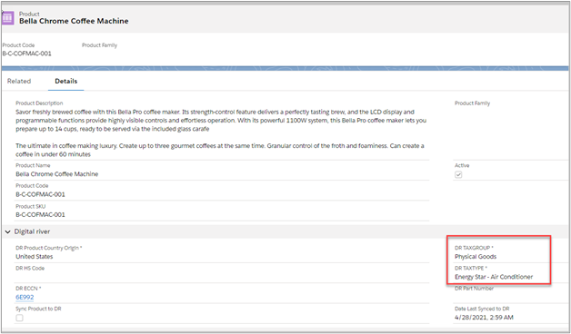 Products missing any required fields (for example, DR Product Country Origin, DR TAXGROUP, DR TAXTYPE, and DR ECCN) will not be synced to Digital River. Digital River uses this information to calculate tax.