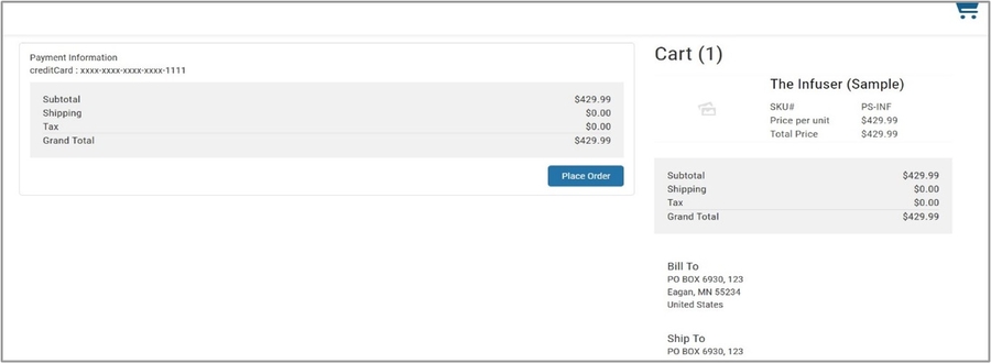 Click Place Order. The checkout and order creation process is completed with an order confirmation.