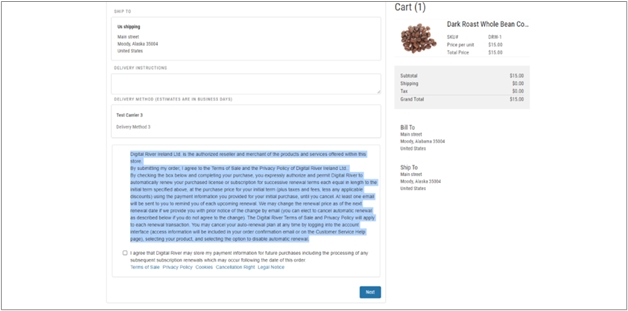 Note: If the cart contains subscription products, the Terms and Conditions include highlighted information about subscriptions.