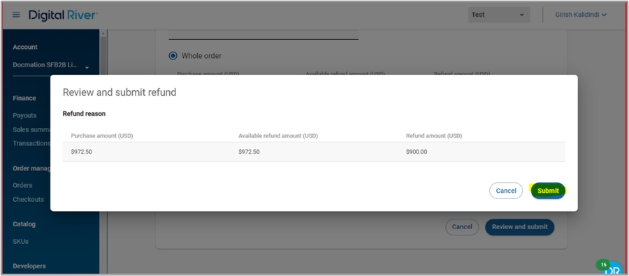 Click Submit. Once the refund is initiated, the record is created in the Refund section of the Dashboard.