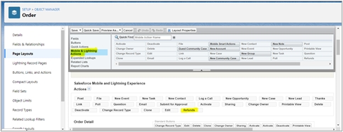 Add the Refunds Action button to the Order page layout. This will be available under Salesforce Mobile and Lightning Experience Actions section.