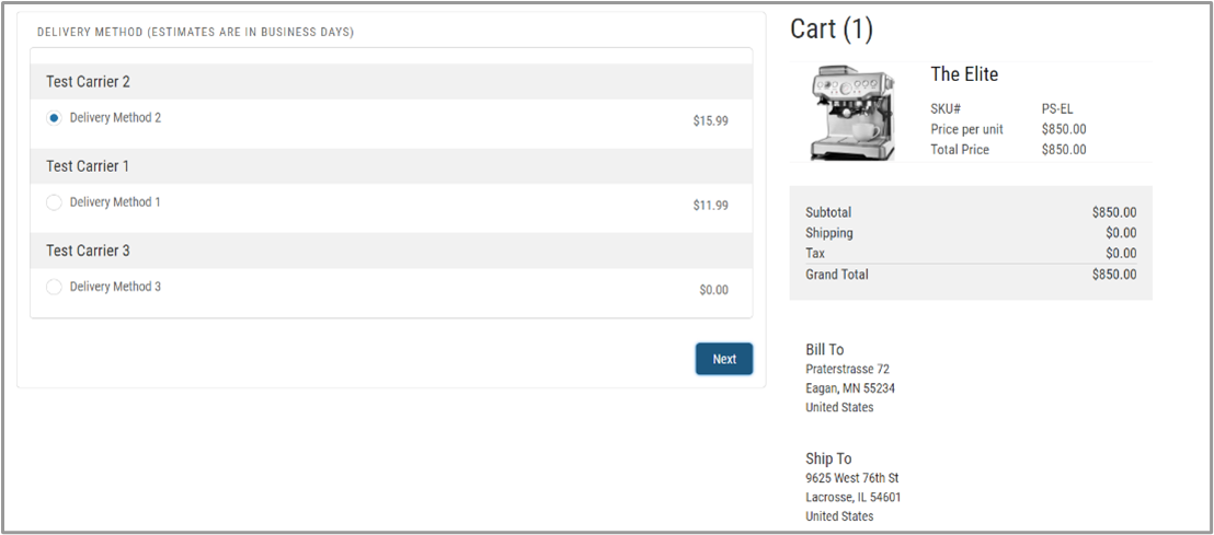 A sample Shipping Integration class has been provided for testing purposes. If you are using the asynchronous checkout flow (Aura), use DRB2B_ShippingSample.txt. If you are using the synchronous checkout flow (Aura), use B2BSyncDelivery.txt.