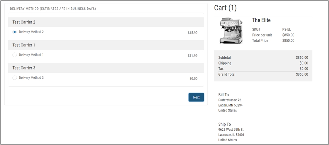 As part of shipping integration, the shipping and delivery methods should not be displayed for digital carts. If the shipping and delivery methods are displayed, they should contain only a $0 option.