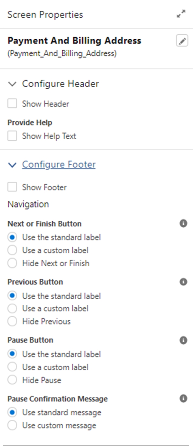 9. Alternatively, choose to hide the Next and Previous buttons on this screen. The OOTB buttons should be hidden on this screen as they are replaced with buttons from the connector.