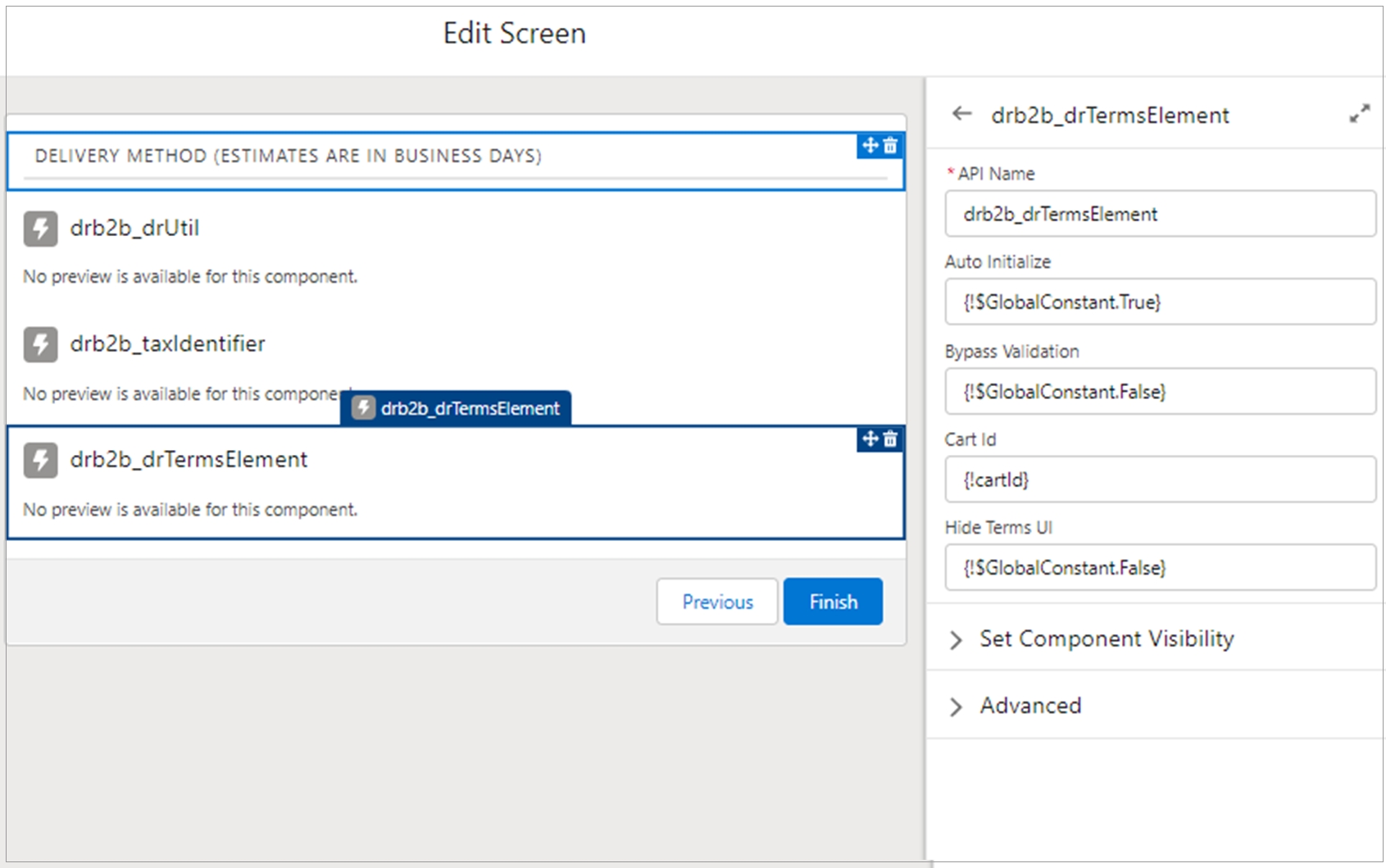 Add drb2b_drTermsElement to screen and enter the following details. Be sure to click through all designer attributes to ensure that the default values are registered by Salesforce.