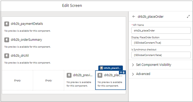 (Optional) Drag drb2b_placeOrder component from the left panel to where you want it to appear on the screen. The connector supports several options for displaying a Place Order button. To add a standalone button in the checkout flow, use the drb2b_placeOrder component.