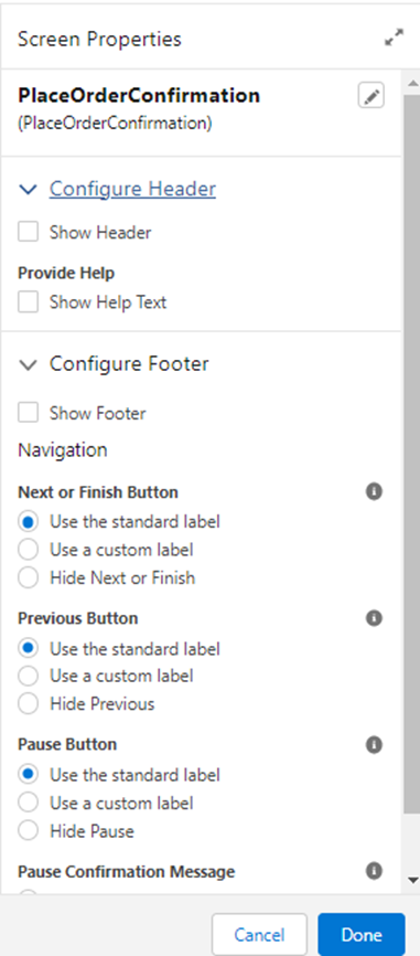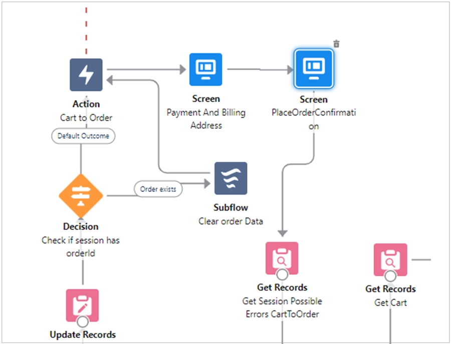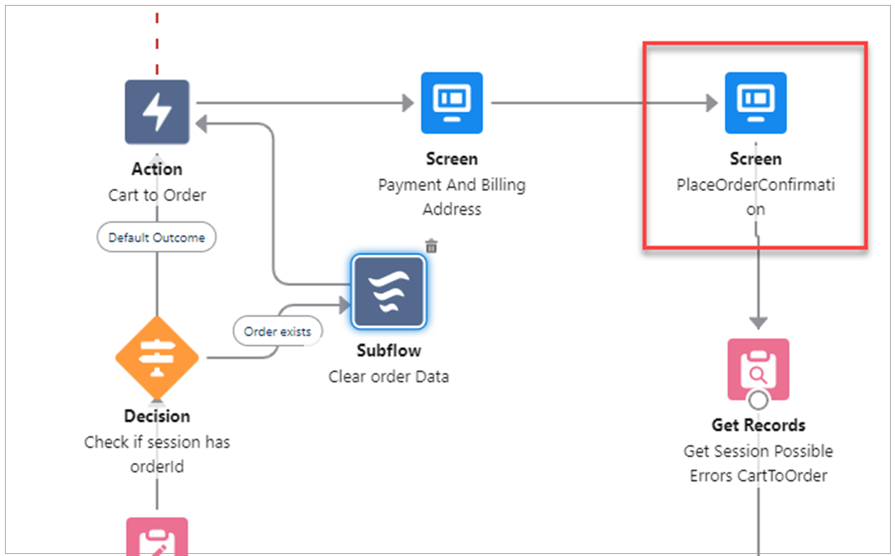 Add a connector from the PlaceOrderConfirmation (Screen) node to the Get Session Possible Errors CartToOrder (Get Records) node.