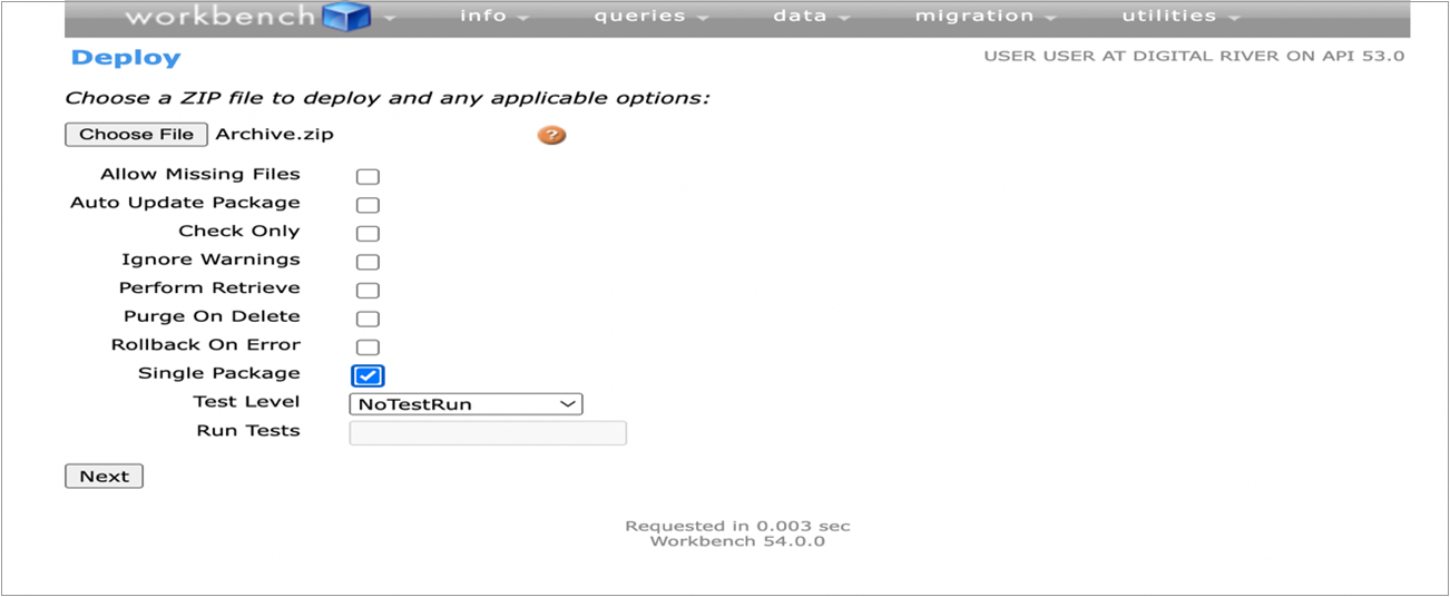 Your Digital River project manager can provide you with a package containing prebuilt flows that can be deployed using Salesforce Workbench. If you choose the pre-integrated option, you are provided with a package that contains a synchronous checkout flow that is pre-integrated with the Digital River components plus dependent subflows. Alternatively, if you choose to integrate the Digital River components into your own flow, the package will contain only the dependent subflows.