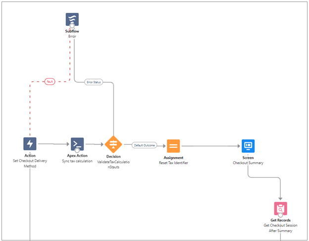 Connect ValidateTaxCalculationStatus (Decision) to Subflow Error. This should use the Error Status Outcome.