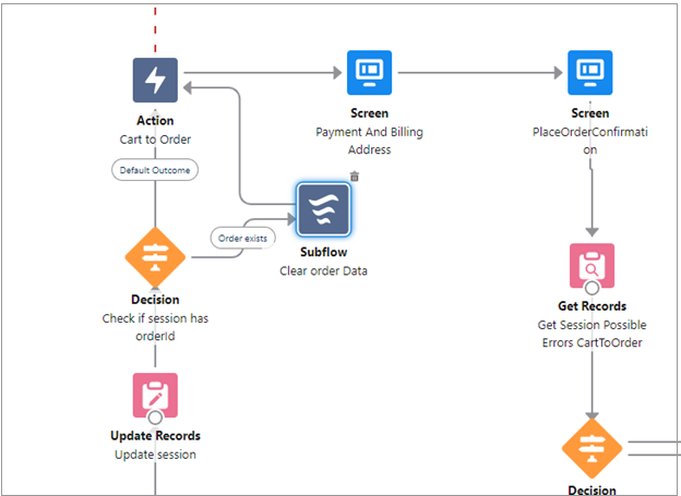 Check if session has orderId (Decision) node to Clear order Data (Subflow) node.