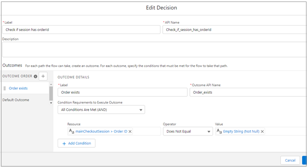 Add the Check if Session has orderId (Decision) node