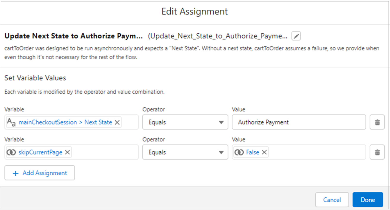 Modify the Update Next State to Authorize Payment (Assignment) node