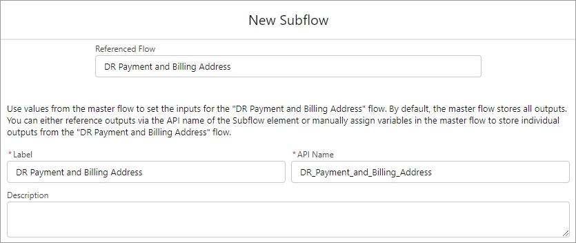 3. Type the name of the subflow in the Label field (for example, DR Payment and Billing Address).