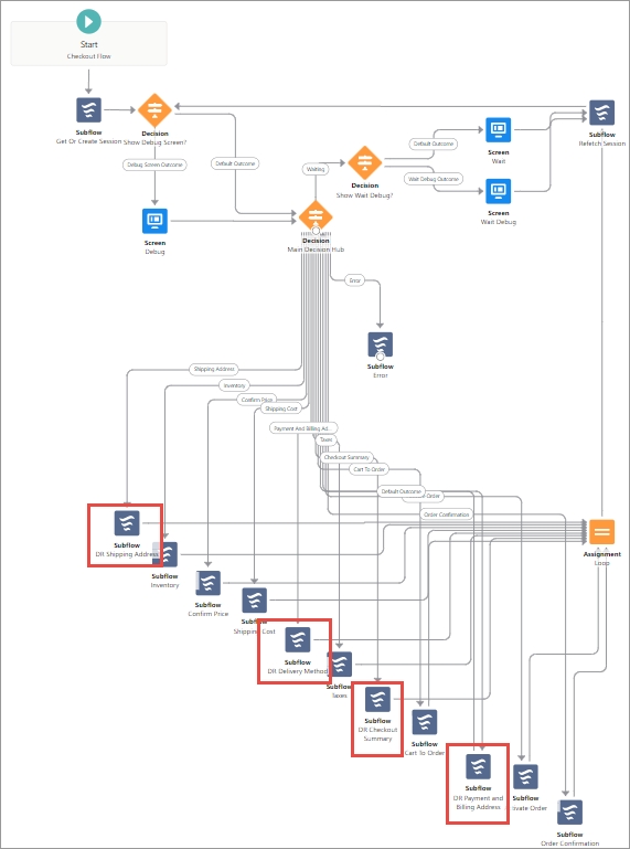 4. Create the subflow element for all the custom subflows (for example, the DR Shipping Address, DR Payment and Billing Address, DR Checkout Summary, and DR Delivery Method) created in the previous steps.