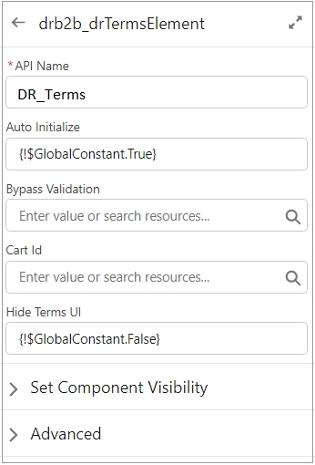 {!$GlobalConstant.True}or{!$GlobalConstant.False}. By default, this value should beFalse. See DR terms component for more information.Hide Terms UI: