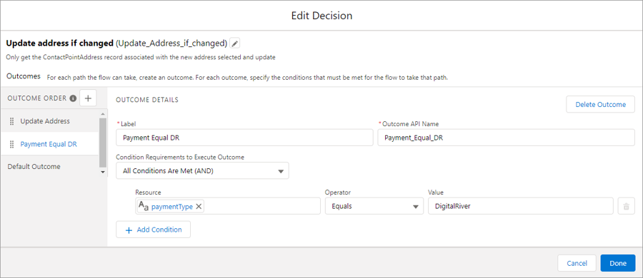 Payment Equal DR.Outcome API Name: The field automatically populates the Payment_Equal_DR value.