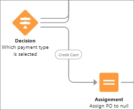 Click the circle below the Which payment type is selected decision element and drag it to the Assign PO to null when the payment type is Digital River.