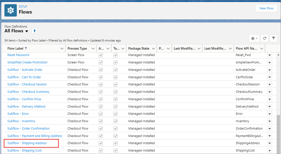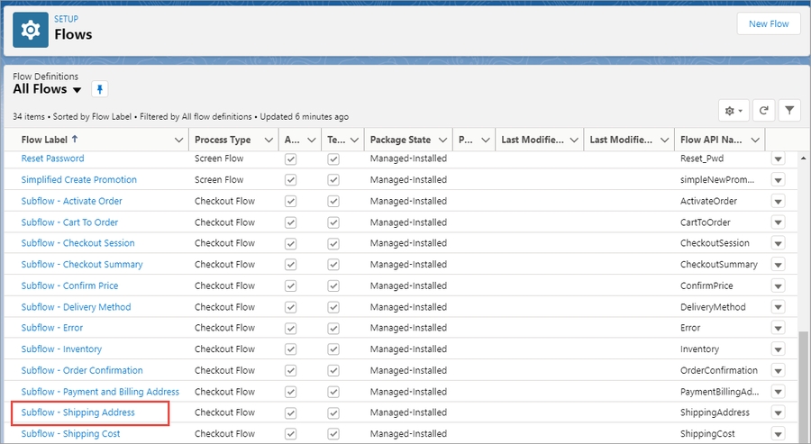 Scroll down and click Subflow - Shipping Address. The Flow Builder opens in a separate tab.