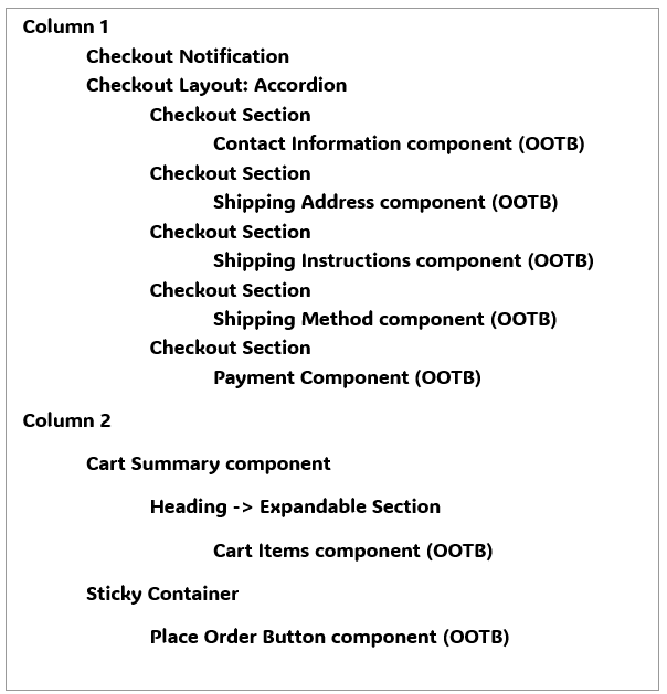 Drag and drop each component onto the Checkout page, following the above page structure. For each component, set the Designer Attributes as indicated in the following steps.
