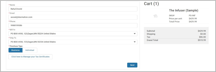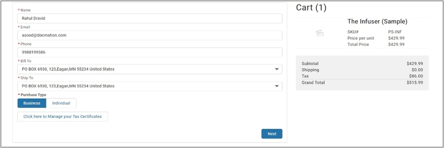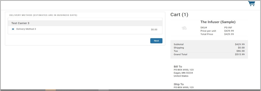 Add required information on the Buyer Info page and click Next. The Delivery Method page appears.