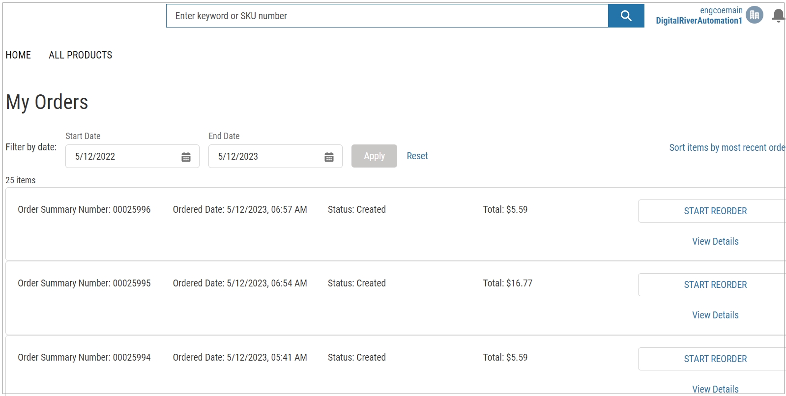 After logging into the storefront, click on the user name to navigate to the main drop-down list.