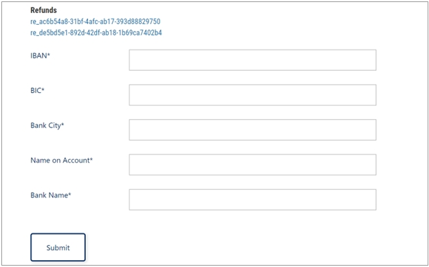 Click the first Refunds link in the list. The refund banking information form appears under the refund links.