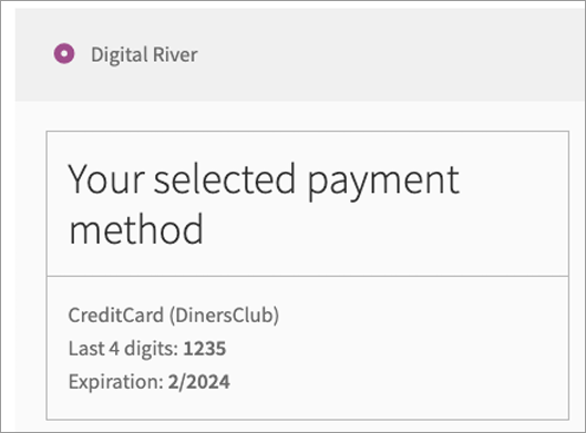 The payment options that appear on the Checkout page are based on the payment methods configured for the shopper's account within the Digital River Drop-in.