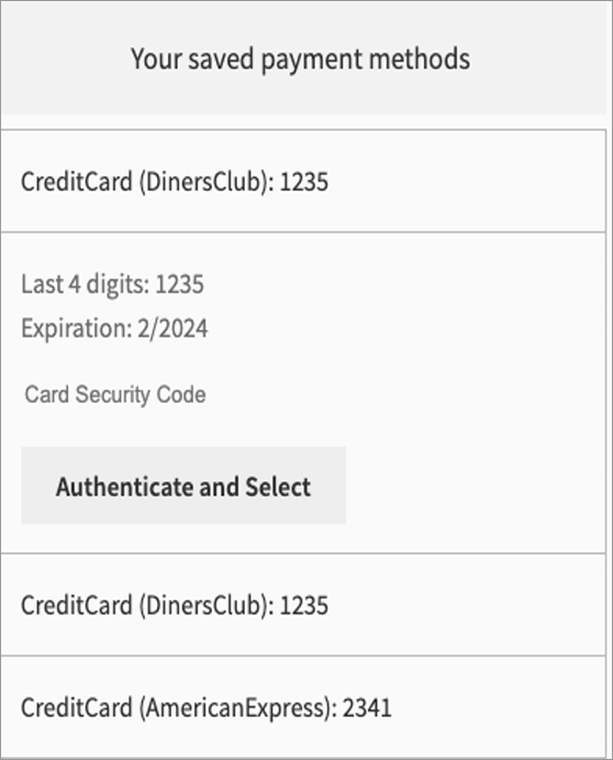 To select a payment method, the shopper clicks Authenticate and Select. The payment method will appear as the selected payment method.