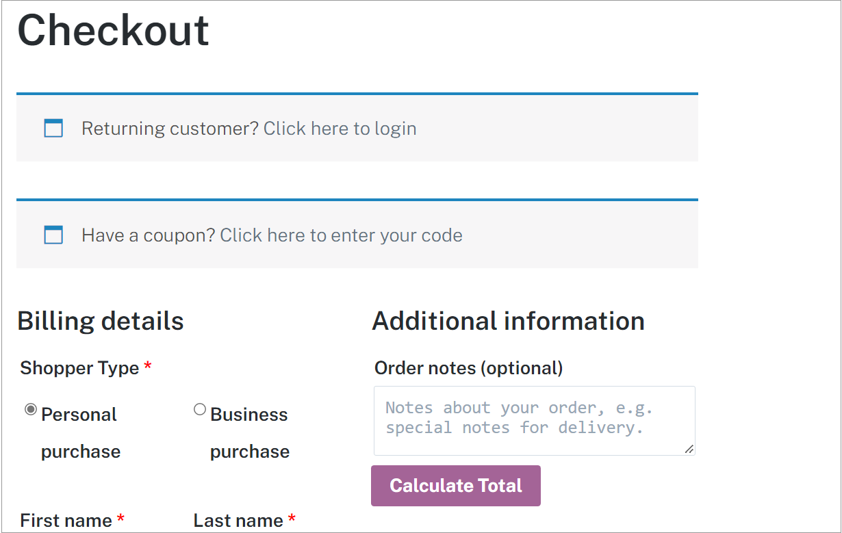 In this process, the shopper needs to click Calculate Total to see the product total and payment methods. Also, every time the shopper changes anything in the order Address, Name, or any other field, they must click Calculate Total to see the changes.