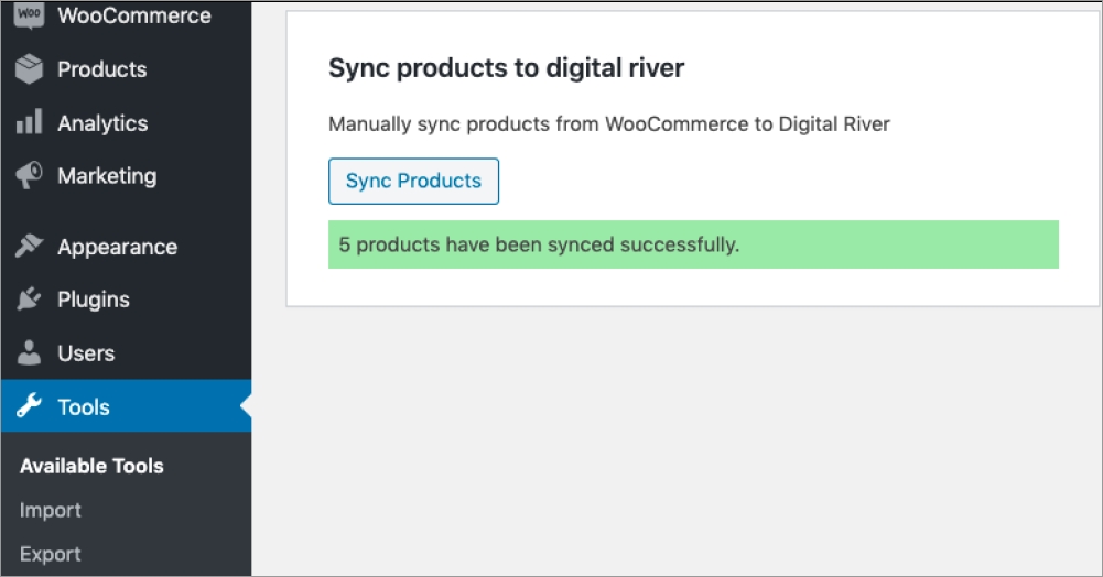 Go to Tools, select Available Tools, click Sync products to Digital River, and then click Sync Products. Sync Products syncs the remaining products.